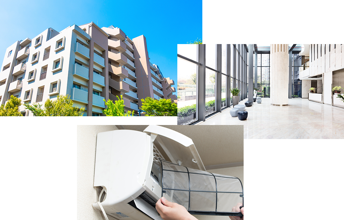 アパート・マンション・ビルなどの定期清掃やエアコンクリーニングも、行っています。